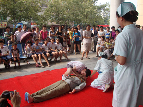 世界急救日宣傳活動 發(fā)布時間:2009年9月15日 預(yù)覽:4234次 值第五個“世界急救日”來臨之際,為彰顯我市120急救中心在我院的社會職能,提高衡陽市廣大市民急救意識,普及急救知識,讓更多的社會人士掌握急救技能,在事發(fā)現(xiàn)場挽救生命和降低傷害程度。在護理部策劃下,急診科于2009年9月12日上午在門診大樓前坪向全體市民舉辦了“急救為人道”的社會公益活動。四名急診??谱o士現(xiàn)場演示急救技能操作(徒手心肺復(fù)蘇、簡易固定、止血包扎、氣管異物排除等),多名觀眾主動上臺學(xué)習(xí)急救技能操作。歐陽茴香主任用通俗易懂的方式解答市民提出的急救問題,工會還準(zhǔn)備精美小禮品發(fā)給參與有獎問答的觀眾,1000本常用急救手冊發(fā)放一空,現(xiàn)場氣氛輕松活躍。成章小學(xué)張校長聞訊帶領(lǐng)全體老師大早來到醫(yī)院,自己也學(xué)的非常認真,他說“香港小學(xué)要求學(xué)生人人掌握徒手心肺復(fù)蘇,以備不時之需,回去我們要全員培訓(xùn),非常感謝貴院給我們提供了這些知識?!?自2005年開始,紅十字會與紅新月會國際聯(lián)合會將每年9月的第二個星期六定為 “世界急救日”。 護理部 來臨