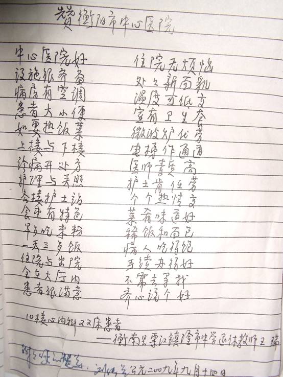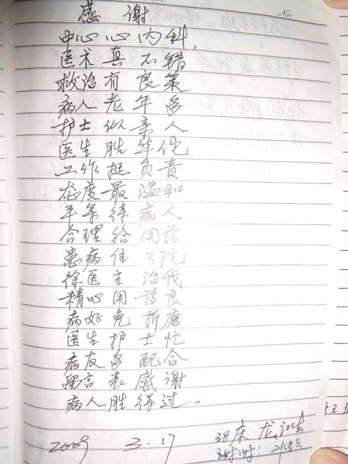 一個留言本的感動 發(fā)布時間:2009年11月13日 預(yù)覽:11665次 一個留言本的感動 中心醫(yī)院內(nèi)科住院大樓十樓心內(nèi)科,醫(yī)護(hù)人員在長長的走廊里輕盈地走過,細(xì)細(xì)的充滿關(guān)切的醫(yī)患交談的話語不時掠過耳畔。 走廊的中間的一幅板報邊,有這樣一個小本子,紅色的封面上寫著“患者留言本”幾個字,這個本子不怎么起眼,也許是翻閱的人多了的緣故,已經(jīng)微微有些發(fā)皺、發(fā)黃。 但是,每次閑暇時翻起時,我們常常會有許多的感動。 寫在上面這些話語,暖暖的,和風(fēng)細(xì)雨般,讓我們感到到作為醫(yī)護(hù)人員是如此的崇高與圣潔。 同時,也讓我們更加堅定在這個平凡的崗位上更加努力的信心與斗志! 我們雖然有些付出,但是我們所收獲的是如此多的真情。 現(xiàn)摘錄以下幾篇與大家共勉。 (心內(nèi)科 周艷輝) …… 在此,謝謝所有的病友,有你們的支持、理解與肯定,我們會倍加的努力!祝你們健康平安!