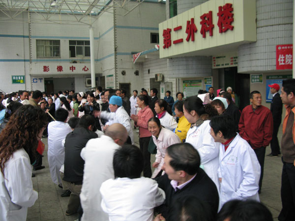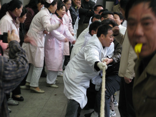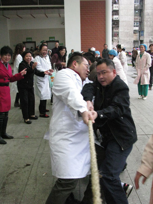 中心醫(yī)院積極倡導(dǎo)運(yùn)動(dòng)防病 發(fā)布時(shí)間:2009年11月13日 預(yù)覽:3538次 中心醫(yī)院積極倡導(dǎo)運(yùn)動(dòng)防病 在全民狙擊甲型H1N1流感病毒的季節(jié),衡陽市中心醫(yī)院身體力行“現(xiàn)身說法”,積極倡導(dǎo)通過科學(xué)運(yùn)動(dòng)提高健康素質(zhì),增強(qiáng)肌體防病抗病能力。繁忙的醫(yī)療工作之余,他們組織員工開展拔河、乒乓球賽、登高等運(yùn)動(dòng)。圖為11月13日,該院醫(yī)護(hù)人員開展拔河活動(dòng)和在門診大樓舉行“挑戰(zhàn)21層”爬樓比賽情景。(鄒建軍)