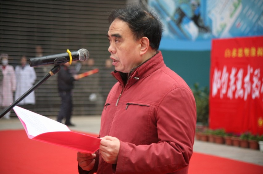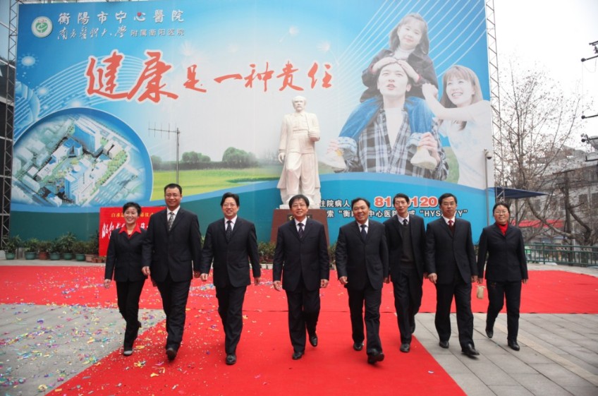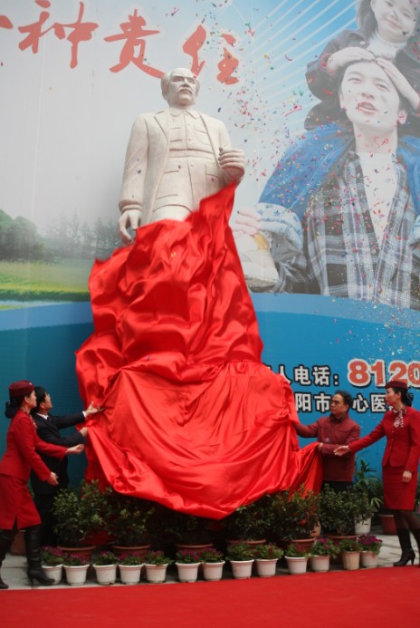 元月16日,在湘水之濱及回雁峰下的我院門診樓前坪,在近千名醫(yī)務(wù)人員鏗鏘有力的《醫(yī)學(xué)誓言》聲中,隨著市衛(wèi)生局黨委書記、局長趙安民和我院黨委書記、院長申錦林將覆蓋塑像的紅色綢布緩緩揭落,湖南省內(nèi)最高“白求恩”邁著矯健的步伐迎面而來。