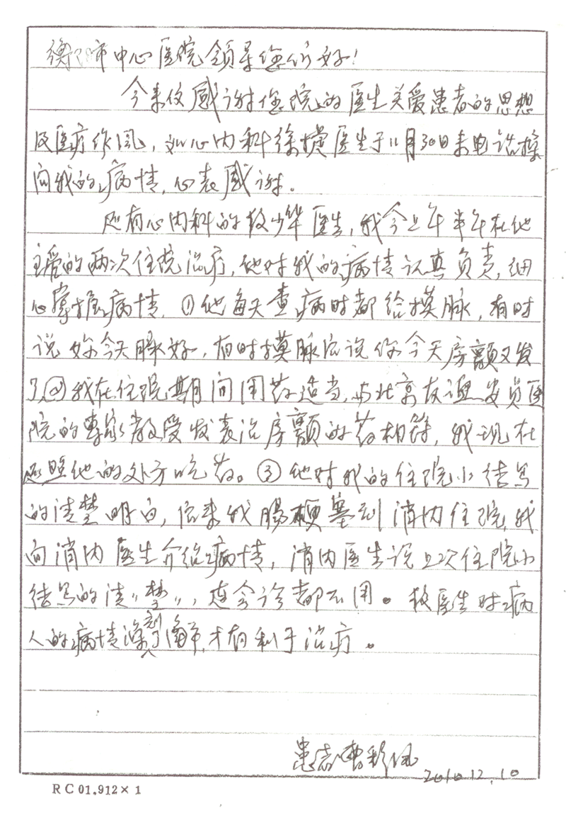 心內(nèi)科一患者的感謝信