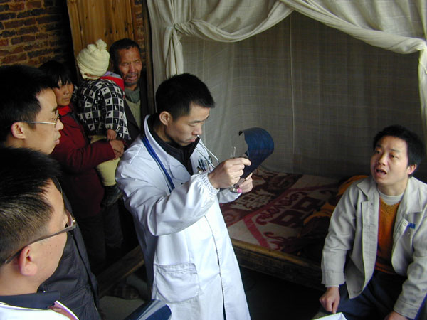 由于村民之間相距遙遠(yuǎn),義診設(shè)點難以照顧到方方面面,醫(yī)務(wù)人員對于不能前來的重病人和年老行走不便的病人,他們向駐點的工作人員了解情況后,還主動上門服務(wù),祁東縣太和塘鎮(zhèn)向陽村一位28歲的小伙子匡旭,5歲喪母,10年前在岳陽中南大學(xué)計算機專業(yè)畢業(yè)后南下廣東打工,與人發(fā)生糾紛,被打腦袋,當(dāng)時限于家庭條件,沒有及時治療,造成腦痿縮加重,行動時全身抽搐,生活難能自理,其父親勞動能力欠佳,爺爺僅靠微薄的退休工資支持孫子,前不久設(shè)法讓孫子到省城醫(yī)院進行了檢查,這次義診的唐九陽博士和神經(jīng)內(nèi)科鞏學(xué)磊專家反復(fù)查看了所拍的CT、磁共振片子懷疑患有原發(fā)性大腦皮層硬化癥,對他的服藥情況進行了分析,離開時對他的康復(fù)治療提出了較好的建議。