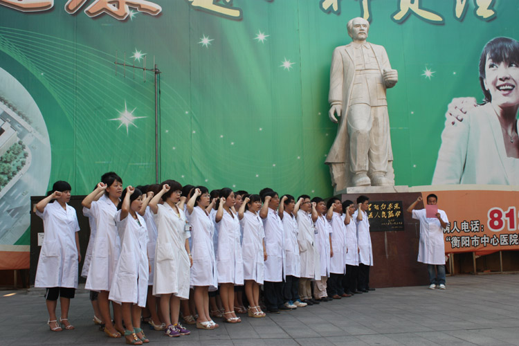我院組織新員工宣誓 發(fā)布時間:2011年7月29日 預覽:3421次 我院組織新員工宣誓 7月29日早上7時,我院門診大樓前坪,迎著當天的第一抹朝陽,我院新進的50名碩士研究生面朝這尊省內(nèi)最高的白求恩塑像,舉起右手莊嚴宣誓。 在鏗鏘有力的《醫(yī)學誓言》聲中,這群身著全新白大褂的“天使”深情感受著這個時刻的神圣。從此,他們告別校園,正式走上“仁心濟世”行醫(yī)路。(鄒建軍)