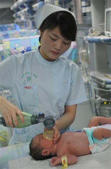 NICU(新生兒監(jiān)護(hù)病房)護(hù)士唐華南正在給新生兒做搶救。
