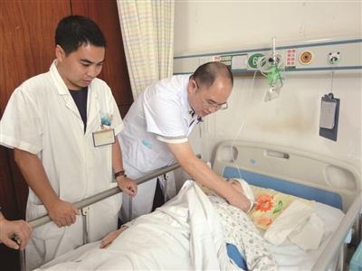 “我婆婆已經(jīng)醒過(guò)來(lái)了,現(xiàn)在能夠說(shuō)話,手腳也能活動(dòng)了?!?月10日,在市中心醫(yī)院神經(jīng)內(nèi)科的病房里,一位阿姨興奮地告訴記者,她婆婆姓文,今年已經(jīng)71歲了, 8月10日晚上,婆婆在洗澡后,突然感覺(jué)頭痛,嘔吐,手腳不能活動(dòng),緊接著就昏迷了。家人急忙將她送到了市中心醫(yī)院搶救。經(jīng)檢查,文奶奶為突發(fā)腦出血,生命危在旦夕。