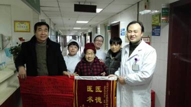 羅奶奶,衡南縣人,98歲高齡,平時跟兒子居住在桂林,2016年1月10日突發(fā)劇烈腹痛,在當(dāng)?shù)蒯t(yī)院就診,確診為“腹腔巨大腫瘤”,急需手術(shù)治療,但因羅奶奶年事已高,耐受手術(shù)能力差,手術(shù)風(fēng)險高,桂林多家大醫(yī)院均拒絕收治。羅奶奶兒子焦急萬分,通過家鄉(xiāng)親戚介紹,慕名前來我院肝膽外科?;颊呷朐汉蠼?jīng)急診CT檢查示:腹腔有一大小15.×16×18cm巨大腫瘤,腫瘤已經(jīng)扭轉(zhuǎn),開始破裂出血,病情十分危重,羅奶奶危在旦夕,只有急診手術(shù)才有一絲希望??粗颊咄纯嗟拿嫒荨⒓覍倨谂蔚哪抗?,手術(shù)做還是不做?如何去做?如果不做手術(shù),患者隨時有生命危險;如果做,年邁體弱的患者能否承受麻醉以及手術(shù)的打擊,能否安全度過圍手術(shù)期,疾病能否得到根治?“醫(yī)者仁心,我無法拒患者于門外,并且我相信我們的科室、我們的團隊、我們的醫(yī)院有這個能力完成這個高難度的手術(shù)!”肝膽外科主任李珍發(fā)如是說。經(jīng)過精心、細致、周密的圍手術(shù)期準(zhǔn)備后,李珍發(fā)主任、副主任醫(yī)師蔣水平帶領(lǐng)科室手術(shù)團隊,在麻醉科主任段雪琴的密切配合下,成功為患者摘除重達10余斤的腹部巨大腫瘤。術(shù)后,在許敏護士長帶領(lǐng)的護理團隊精心護理下,羅奶奶恢復(fù)順利,能下床自由活動,未出現(xiàn)任何并發(fā)癥,10日后痊愈出院。出院時,羅奶奶及全家感激不已,特向科室送來感謝信和錦旗。