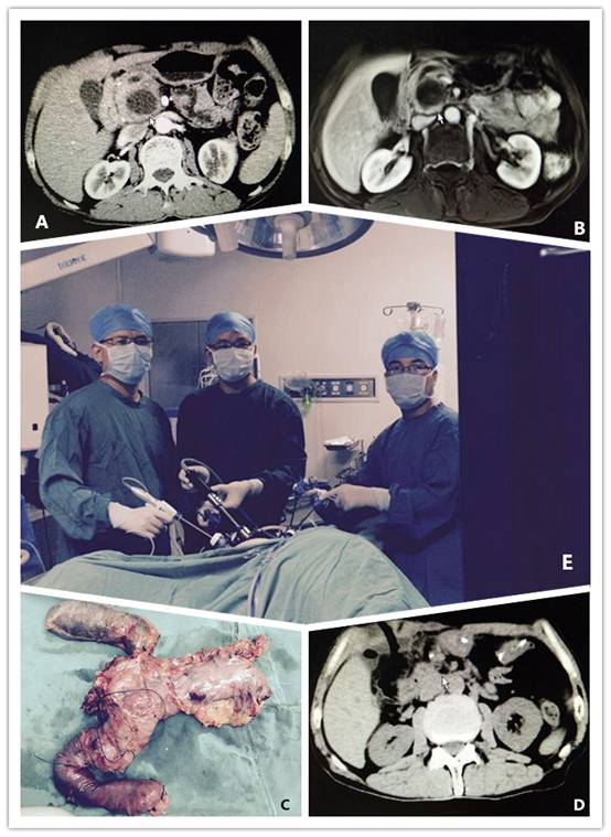 我院成功開展首例腹腔鏡輔助胰十二指腸切除術(shù) 發(fā)布時間:2016年7月6日 預(yù)覽:2161次 近日,胃腸外科成功開展了我院首例腹腔鏡輔助胰十二指腸切除術(shù)。 今年6月,我院胃腸外科收治了一名男性患者,因上腹部疼痛3年入院治療。術(shù)前影像學(xué)檢查腹部增強CT(如圖A)、腹部MRI(如圖B)。由于微創(chuàng)技術(shù)的突飛猛進,加上近幾年來積累的豐富經(jīng)驗,譚曙光主任帶領(lǐng)的胃腸外科微創(chuàng)團隊,果斷決定采用腹腔鏡輔助技術(shù)來完成此例手術(shù)。從建立氣腹、探查、游離顯露、小切口開腹吻合至關(guān)腹,總共歷時約6小時,完整地切除標本(如圖C),術(shù)后患者恢復(fù)順利,病理結(jié)果為胰腺假性囊腫,復(fù)查腹部CT(如圖D),術(shù)后14天患者順利出院。 胰十二指腸切除術(shù)由于其解剖復(fù)雜、毗鄰重要血管,為普通外科疑難手術(shù)之一,也是微創(chuàng)外科領(lǐng)域最難攻克的堡壘。微創(chuàng)胰十二指腸切除術(shù),由于胰頭及壺腹部腫瘤部位解剖復(fù)雜,周圍有重要血管且血供豐富,手術(shù)涉及多個吻合口的重建,具有手術(shù)風(fēng)險大、技術(shù)難度高等特點,是最具挑戰(zhàn)性的手術(shù),同時也是備受爭議的手術(shù)。開展此類手術(shù),外科醫(yī)生精湛的手術(shù)操作技巧、團隊配合是手術(shù)成功的關(guān)鍵。胃腸外科憑借譚曙光主任多年的手術(shù)經(jīng)驗、高超的腔鏡應(yīng)用技術(shù),以及一支優(yōu)秀的腔鏡團隊(如圖E),順利出色地完成了我院首例腹腔鏡輔助胰十二指腸切除手術(shù)。 目前,我院胃腸外科開展的腹腔鏡下胃腸道腫瘤手術(shù)的例數(shù)及其技術(shù)在湘南地區(qū)處于領(lǐng)先地位。該手術(shù)的成功開展,不僅體現(xiàn)了我院胃腸外科的整體實力,也標志著我院在微創(chuàng)外科技術(shù)層面又邁進了一大步。 (賀賽奇)