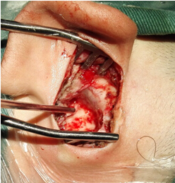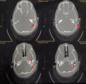 該患兒既往無中耳炎及耳流膿病史,僅表現(xiàn)為1個月前耳后稍有紅腫、疼痛,在當(dāng)?shù)蒯t(yī)院曾被診斷為“蚊蟲咬傷”所致,家長也未引起足夠的重視。近半月來,患兒耳后紅腫疼痛加重,遂到我市某三甲醫(yī)院就診,行高分辨率中耳乳突CT,發(fā)現(xiàn)側(cè)顱底、中耳乳突腔巨大新生物占位,乳突骨皮質(zhì)破壞吸收,并可疑耳后骨膜下膿腫形成。病情若進(jìn)一步發(fā)展,膽脂瘤破壞顱底骨質(zhì),將極有可能并發(fā)腦膜炎、腦膿腫,甚至出現(xiàn)敗血癥、腦疝等,危及生命。