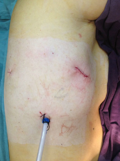 2、胸腔鏡鏡頭支點可置于肋骨上緣或切口兩端,減少了Trocar 的置入,減輕了對肋間神經的卡壓,緩解了患者術后疼痛;