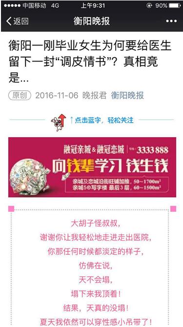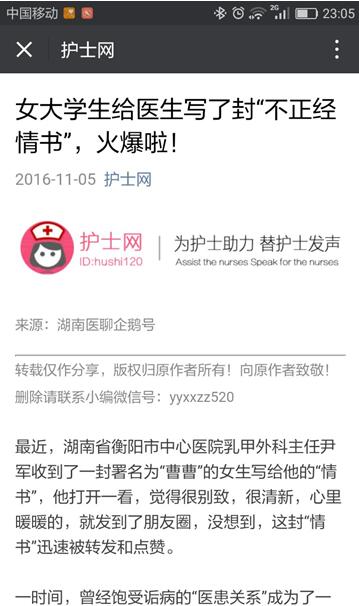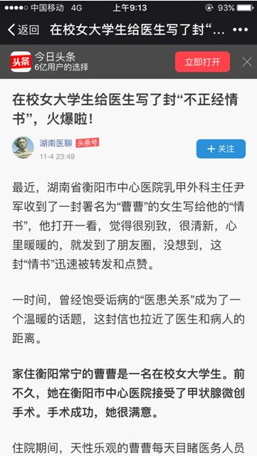 近日有一封患者寫給醫(yī)生的“不正經(jīng)情書”意外在網(wǎng)絡(luò)走紅,今日頭條網(wǎng)、搜狐網(wǎng)、騰訊網(wǎng)、網(wǎng)易、護(hù)士網(wǎng)等國(guó)內(nèi)主流媒體報(bào)道后引來幾十萬的閱讀量!