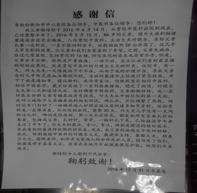 2016年12月21日,中醫(yī)科收到一封特殊的感謝信?;颊咧x培標的女兒將一封經(jīng)過塑封的感謝信激動地送到醫(yī)生辦公室,并說:“本來想做一面錦旗,但是覺得錦旗不能表達我的感謝之情,所以做了幾封感謝信,把我父親的治病過程寫了一下。謝謝你們科室的各位醫(yī)生?!?BR> 患者謝培標是一位86歲的老大爺,今年2月突發(fā)腦梗塞(左側(cè)額、頂、枕葉大面積腦梗塞),在我院神經(jīng)內(nèi)科