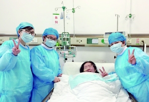 張女士與醫(yī)務(wù)人員在病房打出“V”字手勢(shì)