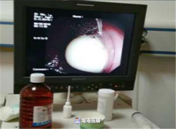 進鏡至乙狀結(jié)腸(約距肛門20cm)處發(fā)現(xiàn)存留在患者腸道內(nèi)的異物,為一乳白色、表面光滑、具有彈性的異物。