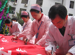 我院結(jié)合開展醫(yī)院管理年活動(dòng)促進(jìn)醫(yī)院服務(wù)質(zhì)量不斷優(yōu)化 發(fā)布時(shí)間:2006年5月17日 預(yù)覽:5095次 湖南省衡陽(yáng)市中心醫(yī)院結(jié)合開展醫(yī)院管理年活動(dòng),強(qiáng)化對(duì)醫(yī)護(hù)人員進(jìn)行醫(yī)德醫(yī)風(fēng)和職業(yè)道德教育,促進(jìn)醫(yī)院服務(wù)質(zhì)量不斷優(yōu)化。圖為該院組織醫(yī)護(hù)人員舉行“崇尚醫(yī)德”宣誓和“仁心濟(jì)世”簽名活動(dòng)?! ?BR>(鄒建軍攝影報(bào)道)