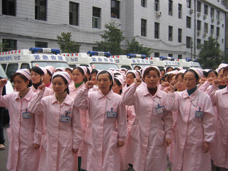 市中心醫(yī)院著力營造尊重病人,照顧病人,體貼病人的人性化服務(wù)氛圍,強(qiáng)調(diào)醫(yī)護(hù)人員與病人溝通的藝術(shù)化和親和力。醫(yī)護(hù)人員在進(jìn)行禮儀培訓(xùn)。