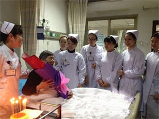 第二個故事發(fā)生在去年12月,80歲的汪奶奶因膽總管結(jié)石疼痛得厲害,被送到衡陽市中心醫(yī)院肝膽外科住院治療。12月10日是汪奶奶的80歲生日,上午9時,肝膽外科的護(hù)士們的白衣天使們捧著生日蛋糕和一束康乃馨,唱著歡快的生日快樂歌走到了她的床邊,“奶奶,今天是您的生日,我們給您祝壽來了!”護(hù)士長許敏帶領(lǐng)全體護(hù)士姐妹們齊聲為老人送上了飽含祝福的吉祥話,祝愿老人健康長壽。在生日蠟燭的燭光下,奶奶露出了溫暖而又真摯的笑容,老人說這是她有生之年過得最開心的一個生日。現(xiàn)場濃厚和溫馨的場面,不僅讓汪奶奶特別激動,就連其家人和同病房的病友也感動地流下了熱淚。