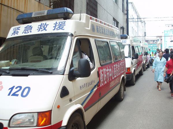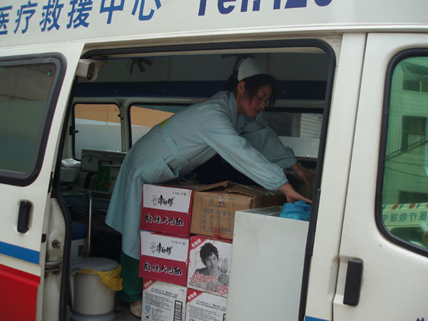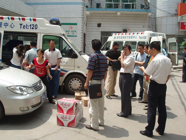 5月13日下午,市中心醫(yī)院憑著多年積累的緊急救援經(jīng)驗(yàn)和職業(yè)敏感,在第一時(shí)間開始啟動(dòng)《重大自然災(zāi)害醫(yī)療救援應(yīng)急預(yù)案》,成立了專門組織機(jī)構(gòu),配備了相關(guān)醫(yī)務(wù)人員和物資,設(shè)計(jì)了具體工作流程。5月14日上午8時(shí),醫(yī)院院長(zhǎng)申錦林在接到上級(jí)指令后,當(dāng)即提出“把保護(hù)災(zāi)區(qū)人民生命安全放在第一位”,立即通知相關(guān)人員進(jìn)行集結(jié)。半個(gè)小時(shí)后,6名年輕力壯的司機(jī),3臺(tái)配置呼吸機(jī)、監(jiān)護(hù)儀、除顫儀等一流搶救設(shè)施的救護(hù)車以及相關(guān)急藥品和食品迅速組織到位。11時(shí)許,在劉小平副院長(zhǎng)的帶領(lǐng)下,三支救護(hù)隊(duì)按照要求從醫(yī)院整裝出發(fā),下午兩點(diǎn)抵達(dá)省衛(wèi)生廳與兄弟醫(yī)院匯合,隨即趕赴災(zāi)區(qū)。