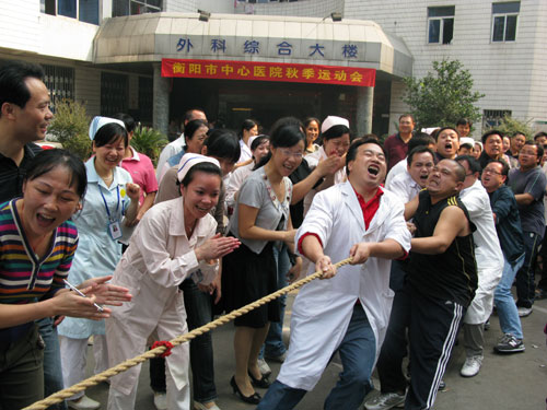 我院秋季運動會圓滿落幕 發(fā)布時間:2008年10月24日 預覽:4079次 本報訊 在新醫(yī)改即將出臺的社會背景下,市中心醫(yī)院致力于加強醫(yī)院文化建設、科技進步和人才隊伍建設,以提升醫(yī)院綜合實力和促進持續(xù)發(fā)展。最近,該院組織全院醫(yī)務人員和患者舉行了一場聲勢浩大的秋季運動會,開展登山、籃球、乒乓球、拔河、象棋等項目比賽,進一步激發(fā)了醫(yī)務人員的工作熱情,融洽了醫(yī)患關系。圖為拔河比賽場景。 (鄒建軍)