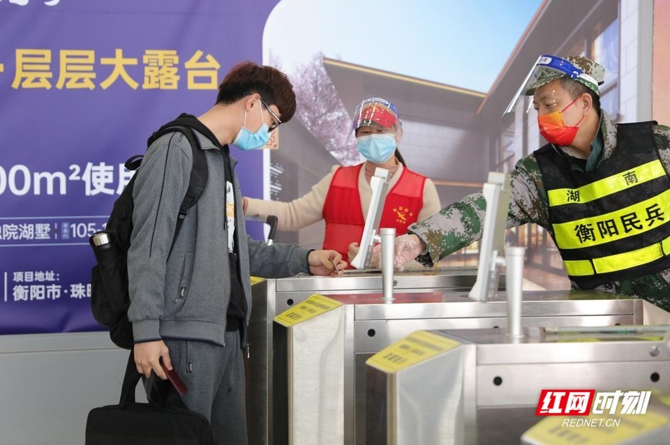 在高鐵衡陽東站進站口,“疫情防控監(jiān)督員”微笑著提醒旅客要掃健康碼、行程碼等,查驗完畢方可進入。